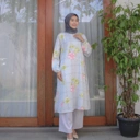 Amira long tunik terbuat dari kain dealova motif, jenis bahan silk printing yang mewah dan cocok banget buat acara formal.